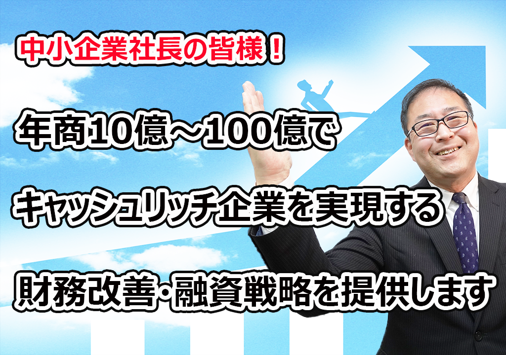 「社長の社外CFO戦略財務コンサルタント」が、中小企業社長の財務パートナーとして、社長の資金繰り不安・銀行融資の不安・社長の財務スキル不足の不安・その他経営上の不安を解消して、年商10億~年商100億キャッシュリッチ企業になるための財務改善・融資戦略等をご提供させて頂きます。